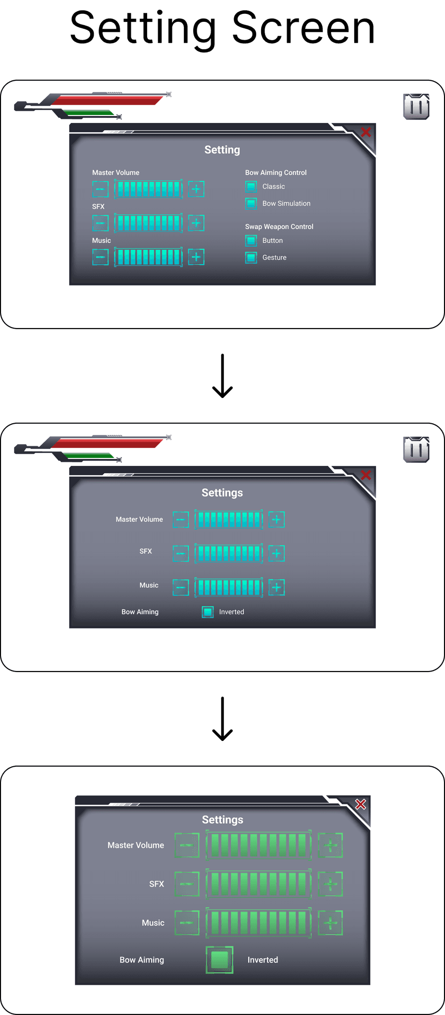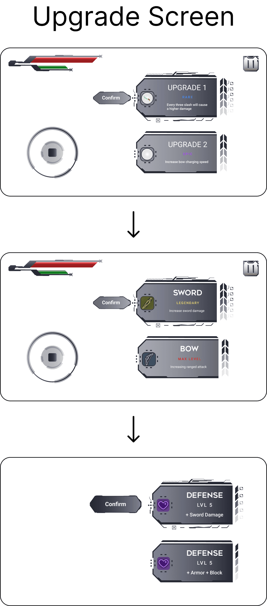 The design logic of the upgrade screen is when the player select one of the upgrade options, it will display a more complicated UI. The iterations were based on the players’ feedback that the arrows made it confusing.