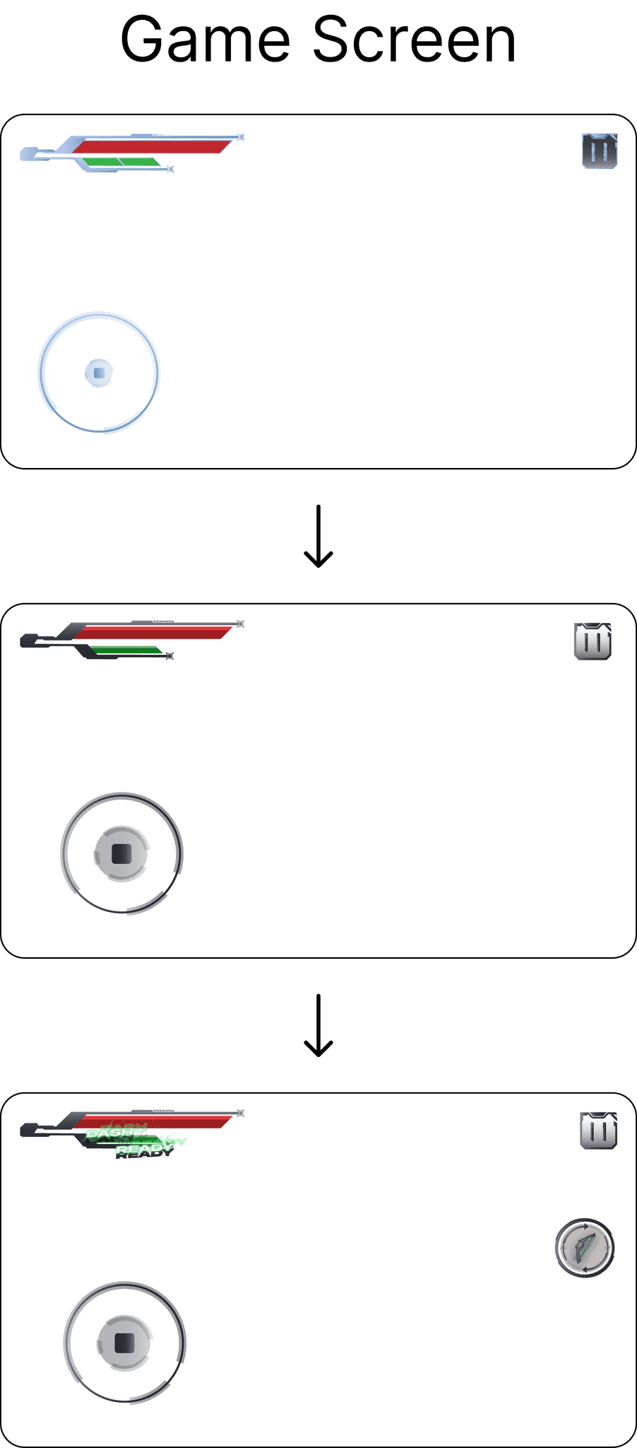 The main game screen need to be simple and contain all the HUD UI elements. Through the iteration, the elements are designed to become more obvious over the gaming background and easier to perform the character actions.