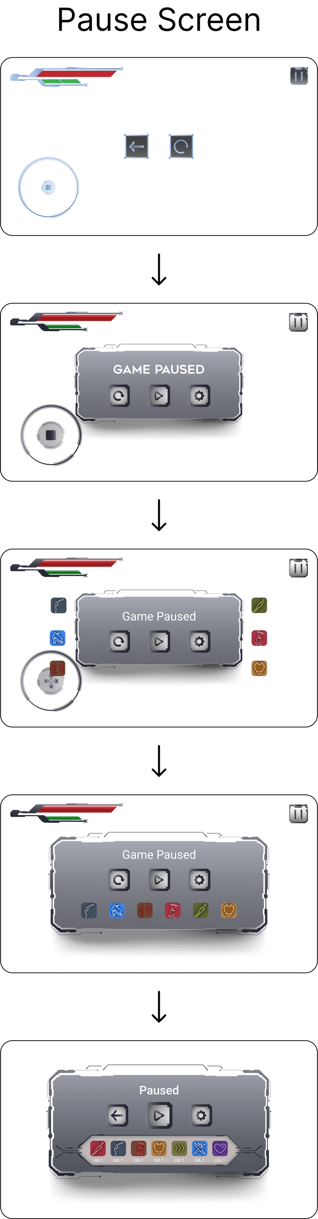The pause screen have experienced the most iterations. The first ones only have the basic features. Then the iteration are about how to show the players’ upgrade levels in a clear and readable method.