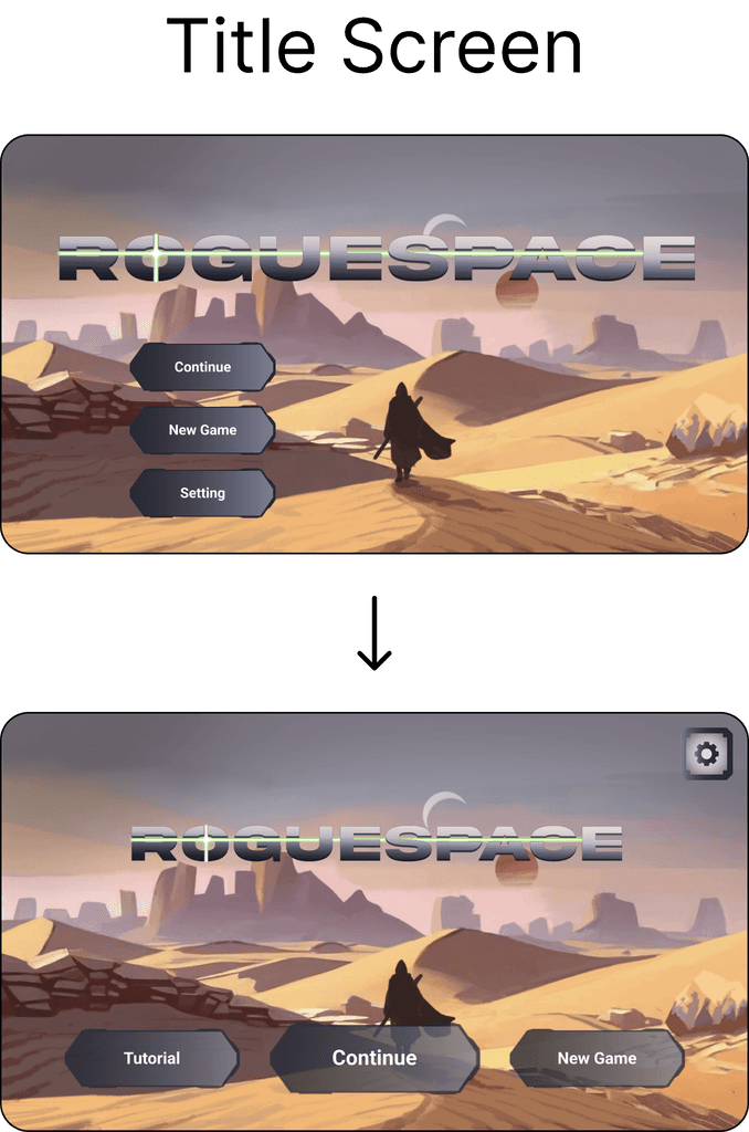 The first layout of the buttons on the title screen inspired by the typical button layouts of PC games. Users’ feedback provides a alternation that the buttons should be larger and have a horizontal layout since it is on mobile platforms.